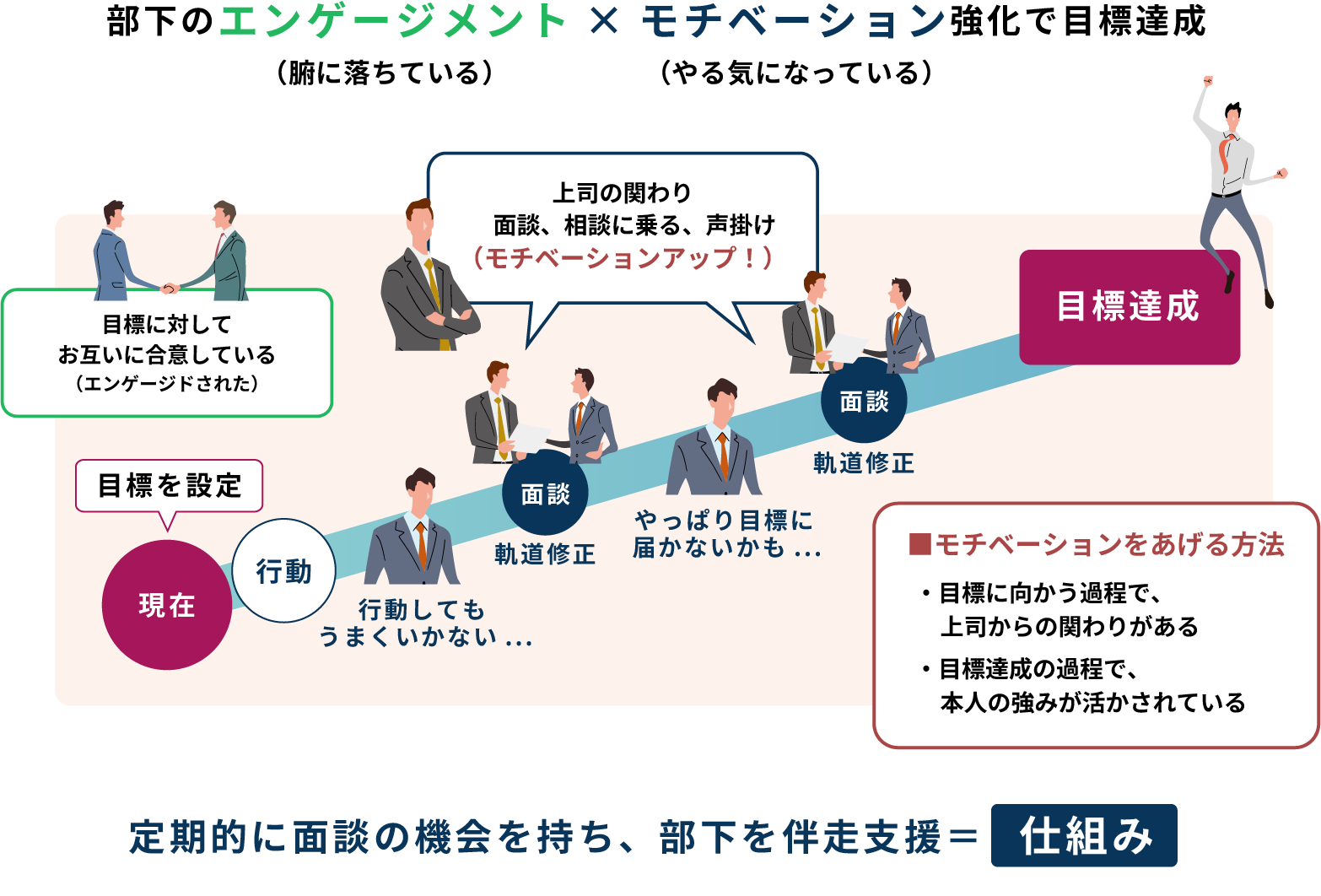 制度を現場の“習慣”に落とし込み、1on1や評価者フィードバック研修を通じて、運用を自走させます。
